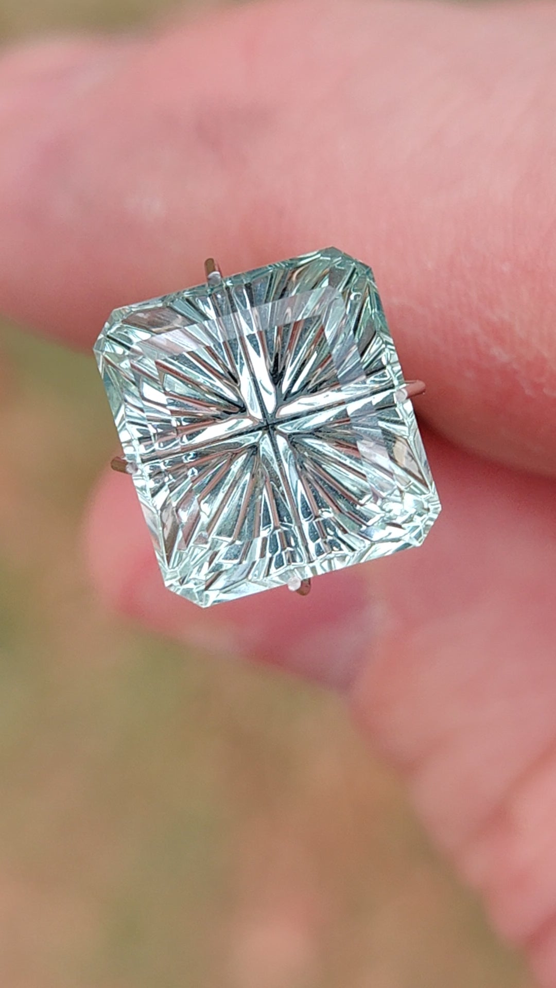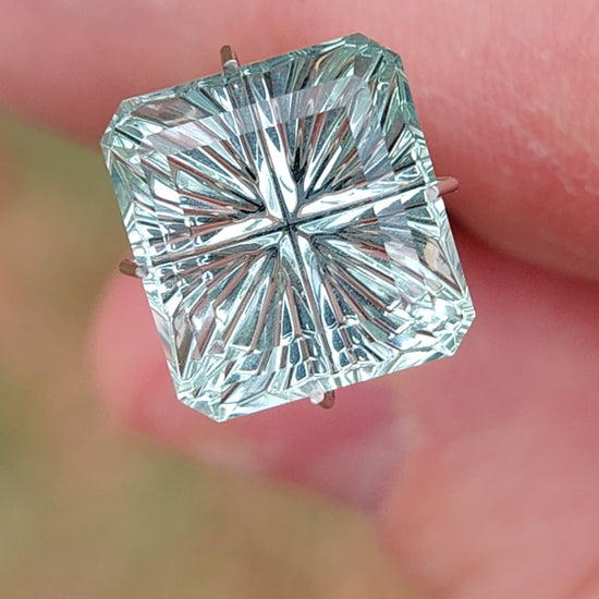 Here is a lovely Aquamarine gem! The color is a ice blue that is bright, demonstrating the carved features beautifully. The stone has a gorgeous bright polish. The fantasy features are a radial cut, that are framed in this Square Emerald shape. The effect of the design is mesmerizing when reflected off of the polished sides. This size gem will make a stunning piece of jewelry! Cut at Kosnar Gem Co, Colorado, USA. Enjoy!