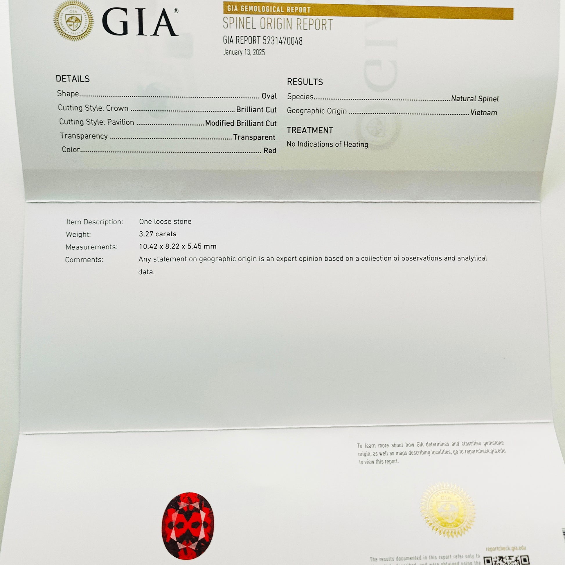 Spinel, 3.27 cts., 10.4x8.2 mm., Oval, Red, Vietnam, GIA Cert.