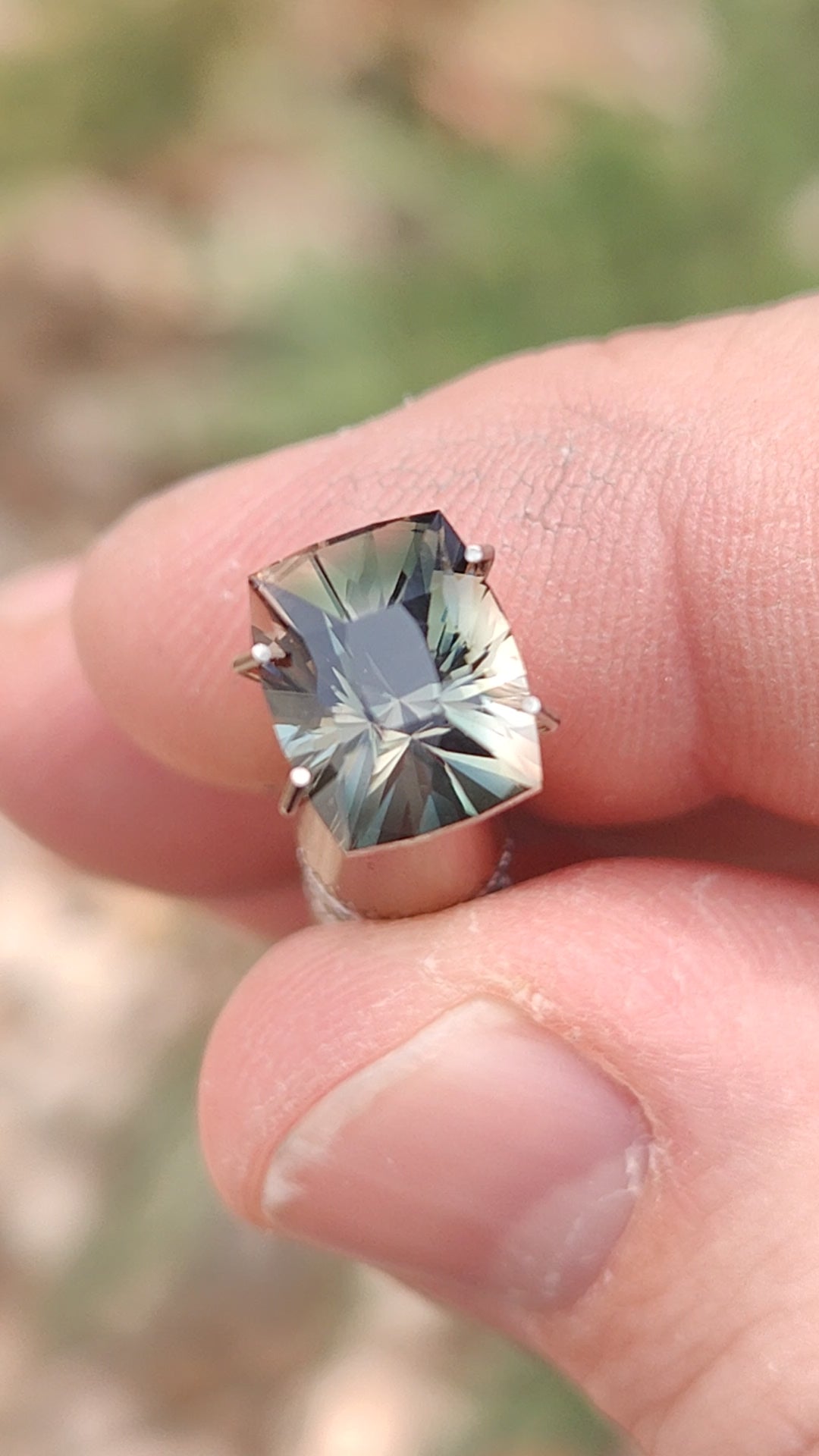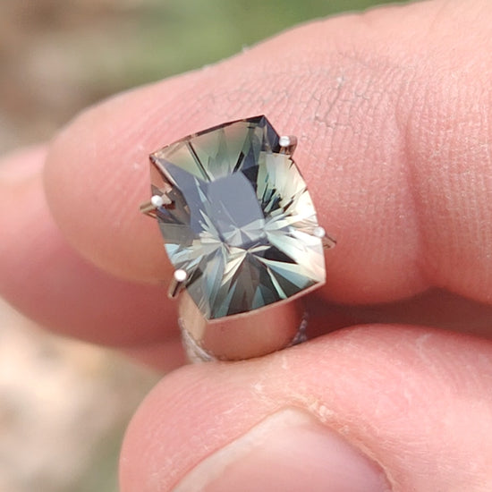 Here is an amazing Sunstone gem! Oregon Sunstone is one of the most beautiful gems for North America, and is one of the few elite gemstones that are naturally red color. What is rarer than the excellent red color is blue. Few of the Oregon Sunstones come in a distinct blue color, and most times the blue is joined by red and makes for dark stones when the colors are mixed. This material is strongly dichroic, displaying a stunning blue/green color from one direction and a lovely copper/red from a 90 degree turn. This allows us to isolate the colors nicely and create excellent results. The Oregon material is typically included with “Shiller” or Copper particles that give gemstones a beautiful and unique appearance. However, this stone has almost none of the Shiller. It has been custom faceted into this barion cushion shape that looks fantastic on this material. The stone was oriented with the blue color face up, but along the edges the copper and champagne colors come through for a beautiful bi-color effect. The stone rolls with glitter when moved on the hand. This is one of the finest blue Sunstones we have ever had, and extremely difficult to replace in this quality. Cut at Kosnar Gems, Colorado, USA. Enjoy!